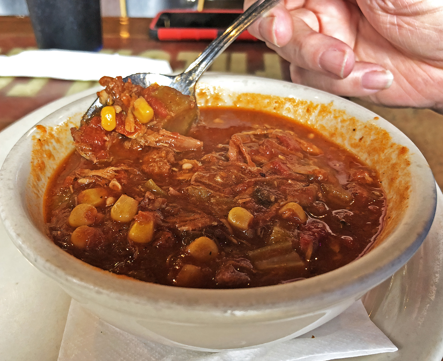 We began our lunch adventure to Wire Mill with appetizers – Bootsie’s Brunswick Stew for my husband, and a ¼ Rack of Baby Back Ribs for me. The stew was a good sized bowl, full of chicken, pork, okra, corn and mildly hot spices. The ribs were tender and flavorful – smoked just right with hints of cherry and apple woods. They were just firm enough to hold on to the bone, but pulled away with ease. Served on the side was their White BBQ sauce that is ranch-based with the tang of horseradish. A nice complement to the savory ribs.